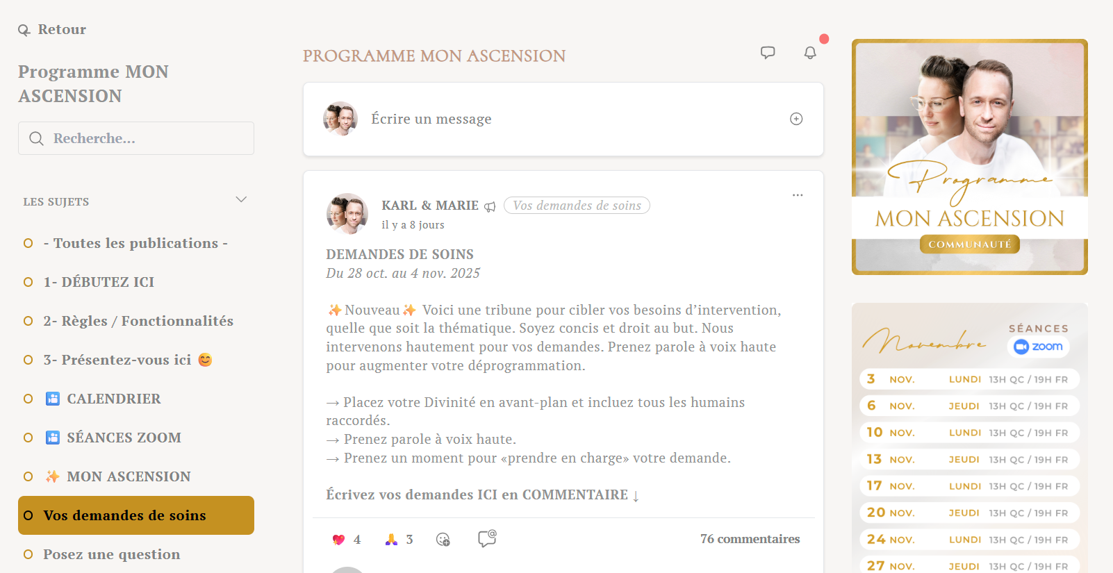 Un espace dédié pour exprimer vos questions concernant l’Ascension. Une communauté prête à vous soutenir dans la prise en charge de celles-ci. Les questions des membres du programme seront traitées en priorité lors des sessions de questions-réponses en direct sur YouTube.